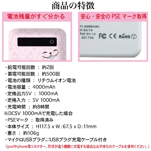 容量は4000mahで、iPhone、Android機器の急速充電に対応しています。